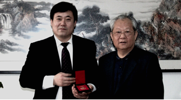 全國工商聯(lián)直屬商會會長翟懷明(右)為華強京工董事長張敬剛頒發(fā)首都五一勞動獎?wù)?/p>